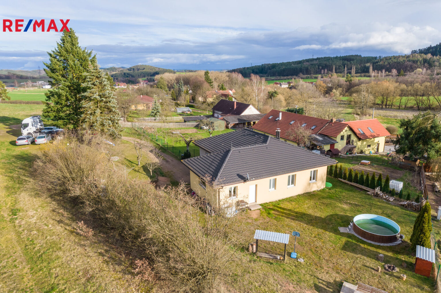 Na pozemku se nachází bazén, studna, u příjezdové cesty vzrostlé stromy a venkovní posezení. Okolní pozemky jsou nezastavitelné, jelikož se jedná o vodní ochranné pásmo = žádní sousedé.