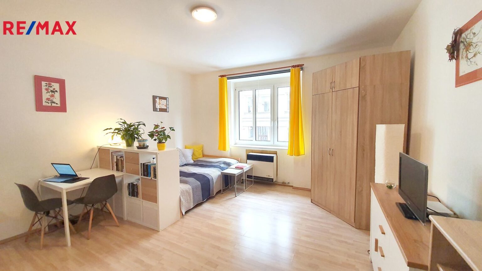 Byt se nachází v prvním patře udržovaného domu. Byt se skládá z prostorné obytné místnosti (cca 25m2) vytápěné plynovými kamny, koupelny se sprchovým koutem a toaletou (cca 5m2) vytápěné el. podlahovým topením a předsíně (cca 5m2). Byt je vybaven kuchyňskou linkou se spotřebiči (lednice, varná deska, mikrovlnná trouba, digestoř) a nádobím, komoda, knihovna, šatní skříň a pračka (umístěna v koupelně). Součástí bytu není rozkládací sedačka nebo postel. Na podlahách je plovoucí podlaha a dlažba, okna jsou plastová.